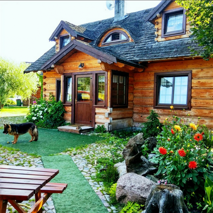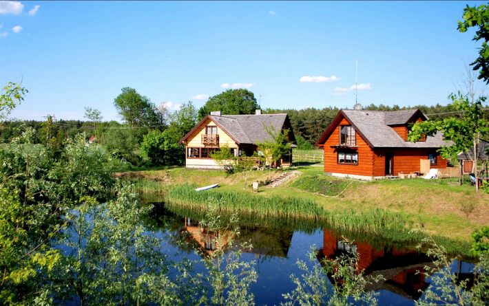 Drugi dom ma powierzchnie 120 m2. Składa się z kuchni połączonej z salonem z widokiem na staw, łazienki z wanną oraz dwóch pokoi. Góra domu do własnej aranżacji. Dom klimatyzowany.