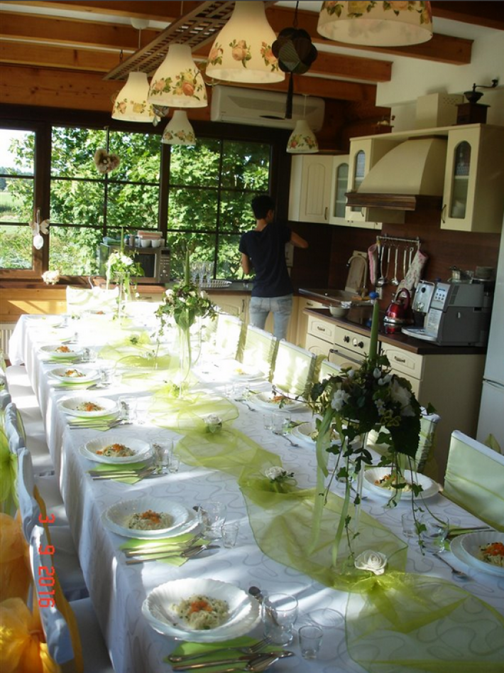 Obok sali znajduję się duża kuchnia z profesjonalnym sprzętem kuchennym: kuchenka czteropalnikowa, piekarnik, zmywarka, lodówka, piec konwekcyjny sześciopółkowy, patelnia gastronomiczna 60 cm.