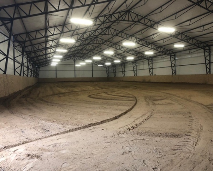 6. Kryta ujeżdżalnia o wymiarach 20 x 56 m z oświetleniem, stalową konstrukcją, oraz dobrze przygotowanym podłożem.