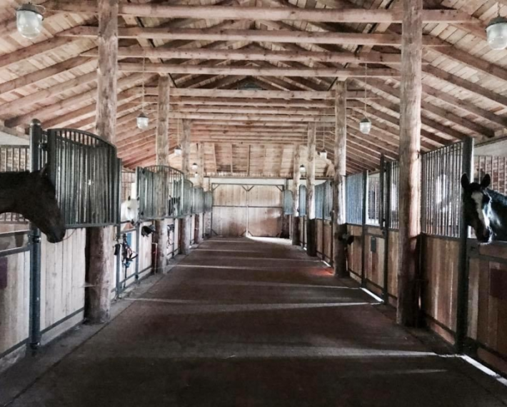 2. Stajnia murowana o wymiarach 11 x 54 m z boksami dla 21 koni (wym. Boksów 3×4 m) , pomieszczeniami gospodarczymi, myjką zewnętrzną, łazienką, dwiema siodlarniami, oraz myjką wewnętrzną z ciepłą wodą.
