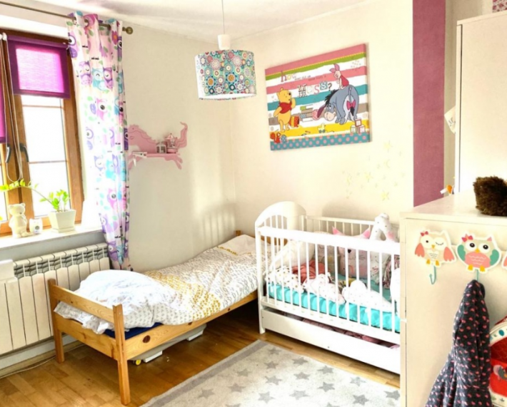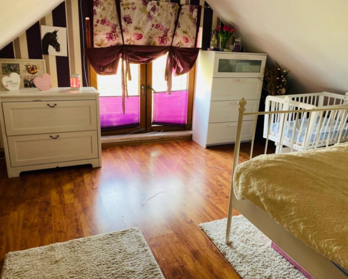 3. Część mieszkalna stajni – 3 pokoje gościnne, dwie łazienki, sala kominkowa, duża kuchnia. Całość ogrzewana piecem, ogrzewanie podłogowe, bardzo komfortowe. Idealne miejsce do prowadzenia obozów jeździeckich.