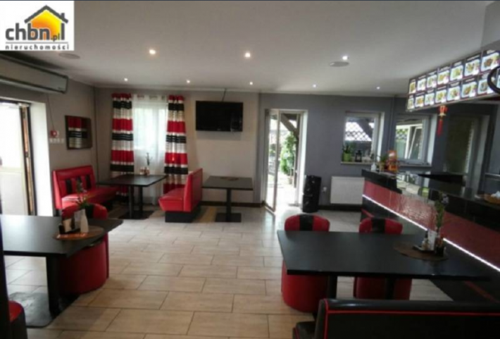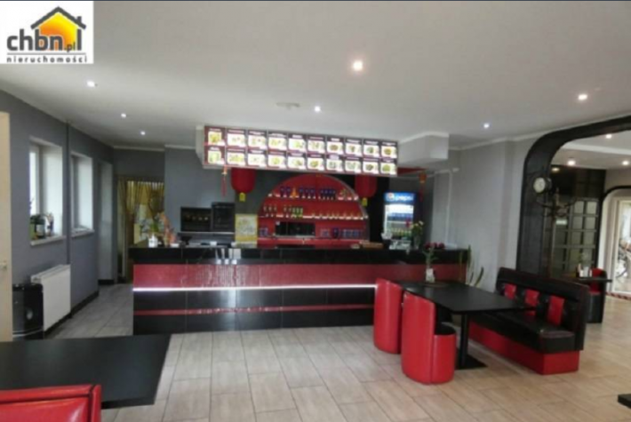 Na parterze- segment gastronomiczny, składający się z dwóch sal jadalnianych, otwartego bufetu oraz szerokiego zaplecza kuchennego. Z tyłu mamy przejście do kilku pomieszczeń mogących służyć za mieszkanie, magazyn, spiżarnię, jest aneks kuchenny, toaleta oraz duży garaż wraz z kanałem przystosowany na wjazd samochodów ciężarowych.
