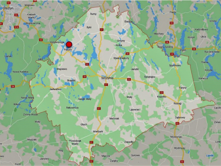Działka inwestycyjna o pow. 69 tys. m2 w Pasymiu - 10 km od Szczytna, 20 km od Olsztyna, 25 km od lotniska Szczytno-Szymany, 200 km od Warszawy, 2010 km od Gdańska, 550 km od Krakowa. Położona nad jeziorem Kalwa (562ha), z bardzo dobrym dojazdem drogą DK53 (nieruchomość w odległości ok. 1 km od tej drogi). Dostęp do infrastruktury energetycznej i wodociągowej. W najbliższym otoczeniu jezioro, łąki i dalej domy jednorodzinne całoroczne oraz letniskowe. Czyste powietrze, bliskość natury, sąsiedztwo klimatycznego miasteczka z ponad 600-letnią historią pośrodku Mazur to atuty tej lokalizacji, którą uznała za b. atrakcyjną także jedna z wiodących światowych grup hotelowych. Teren objęty fragmentem Miejscowym Planem Zagospodarowania Przestrzennego, w dalszej części przeznaczony na obsługę turystyki wodnej, zabudowę letniskową oraz zabudowę usług turystycznych. Na całym obszarze zaprojektowano kompleks całorocznych domów mieszkalnych, marinę, hotel z salą konferencyjną, restauracją i lądowiskiem dla helikopterów. Czynniki sukcesu inwestycyjnego w tę nieruchomość to - oprócz bardzo atrakcyjnej ceny, lokalizacja - tereny rekreacji i turystyki wodnej, w zasięgu infrastruktury energetycznej i wodociągu, brak przemysłu ciężkiego i uciążliwych dla środowiska usług, bezpośredni dostęp do linii brzegowej czystego jeziora, bliskość dróg w dobrym i b. dobrym stanie technicznym. Ponadto duży areał umożliwiający realizację atrakcyjnego projektu a także deklarowana przez miejscowe władze pełna współpraca z inwestorem i pomoc w realizacji przedsięwzięcia.