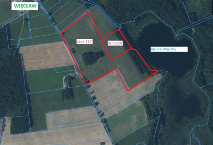 Nieruchomość gruntową w skład, której wchodzą 2 bezpośrednio przylegające do siebie działki rolne położone nad jeziorem Więcław przy drodze gminnej.