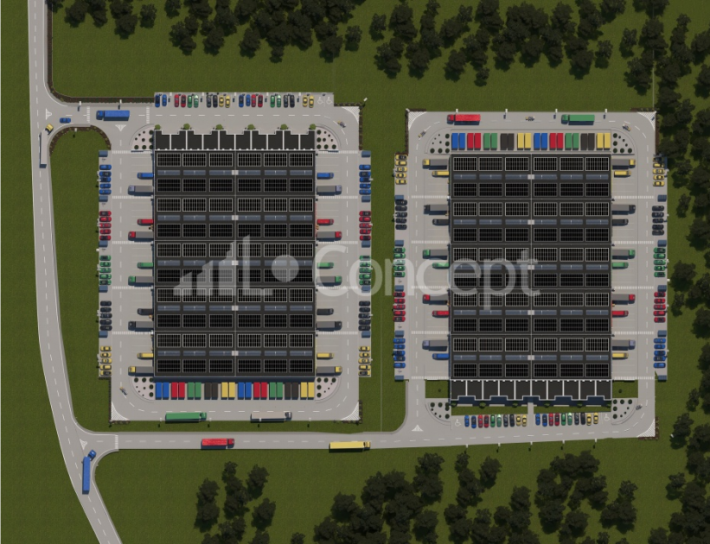 Dla wszystkich modułów łącznie zaprojektowano 102 miejsca postojowe: 70 miejsc postojowych dla sam. osobowych + 30 miejsc dla ciężarówek + 2 dla niepełnosprawnych. Ruch ciężarowy oraz przeciwpożarowy dookoła kompleksu hal. W strefie tzw. brudnej zaprojektowano miejsce na 20 dużych kontenerów na bieżące potrzeby obsługi magazynów.