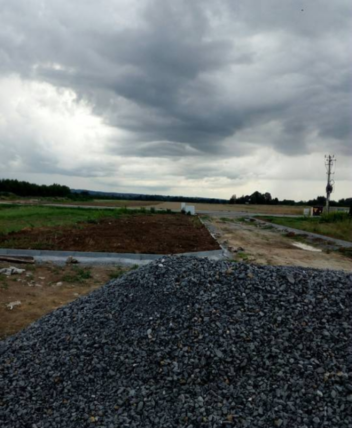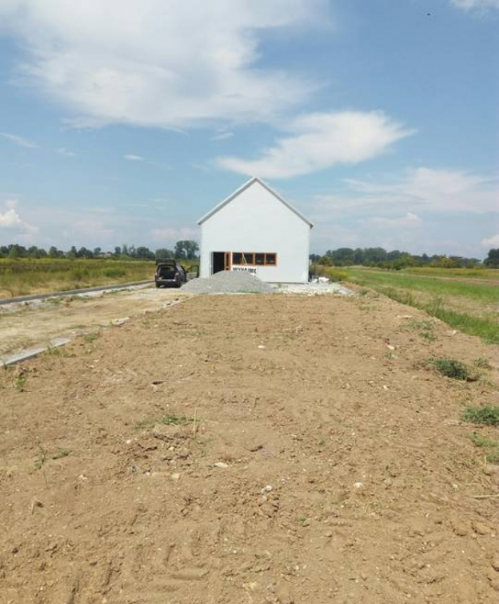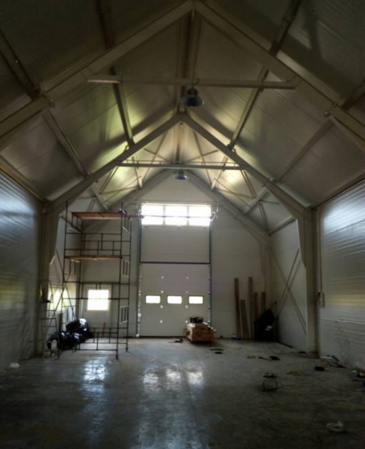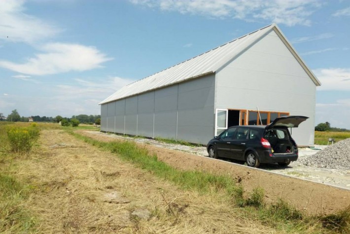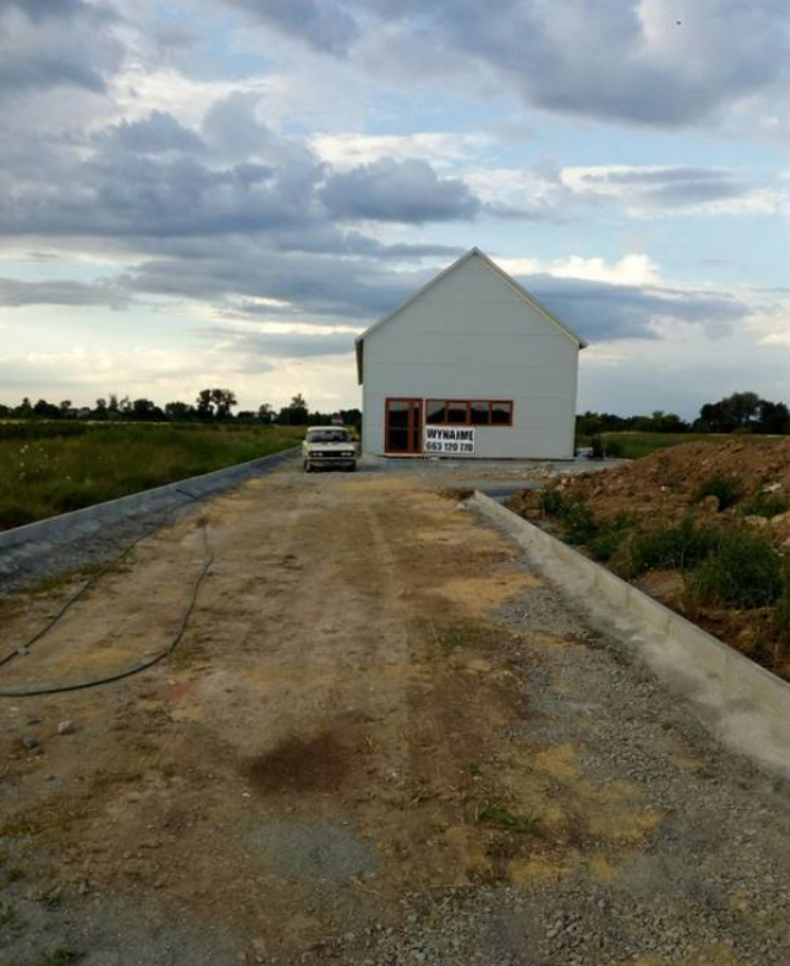 Hala z plyty warstwowej. Prad, woda i kanalizacja podlaczone do hali. Dodatkowo na 80m2 bede montował strop ktore ma słuzyc jako mieszkanie. Wejscie od zewnatrz. Ulozone krawezniki , powoli utwardzam plac .