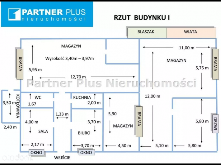 Hala nr 1 - została odnowiona na zewnątrz oraz wewnątrz, budynek jest ocieplony i odmalowany. Hala nr 1 składa się z pomieszczeń biurowych o pow. ok. 40 m2 oraz części magazynowej o pow. ok. 280 m2. Część magazynową można wykorzystać w jej pełnym metrażu lub podzielić na mniejsze pomieszczenia, posiada dwie bramy wjazdowe oraz dodatkowe drzwi wejściowe. Okna PCV nowszego typu, zabezpieczone roletami antywłamaniowymi, dodatkowo zainstalowany został alarm oraz monitoring i klimatyzacja w części pomieszczeń biurowych. Dach betonowy pokryty papą, budynek posiada instalację odgromową oraz wewnętrzną instalację komputerową i internetową rozprowadzoną w pomieszczeniach biurowych. Wysokość pomieszczeń w magazynie 3,40m - 3,97m. Pomieszczenia biurowe ogrzewane są piecem olejowym, który znajduje się w niezależnym pomieszczeniu (tzw. kotłowni) Dostępna jest również sieć gazowa w granicy działki.