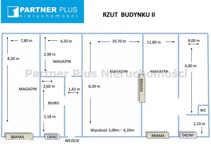 Hala nr 2 - o pow. ok. 400 m2, składa się z części biurowej (34 m2) oraz z części magazynowej, posiada dwie bramy wjazdowe o szerokości 3,00m oraz 3,90m i wysokości ok. 3,00m. Budynek posiada możliwość przesuwania ścian działowych zgodnie z potrzebami użytkownika. Dach o konstrukcji drewnianej, dwuspadowy, częściowo pokryty blachą, budynek od części frontowej docieplony i odmalowany, okna PCV, posadzka betonowa. Wysokość hali ok. 3,00m - 4,20m.