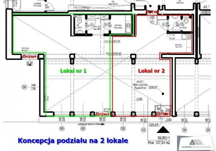 - duża powierzchnia i osobne wejścia dają spore możliwości: wynajem całości lub wydzielenie 2 mniejszych lokali z osobnymi wejściami na wynajem (koncepcja podziału na załączonym rzucie),