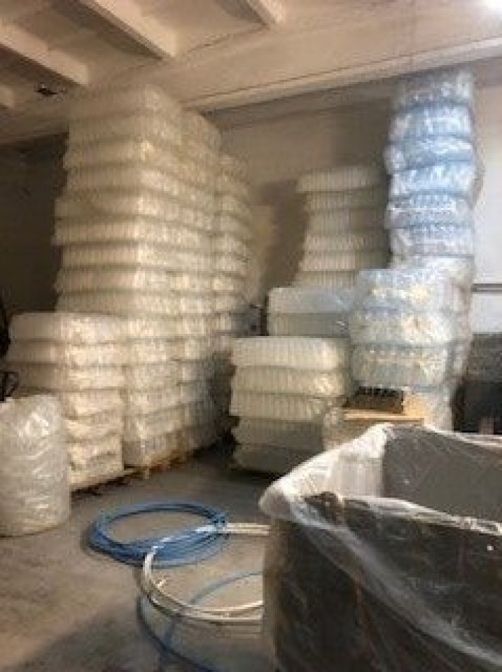 8. W zestawie przekazuje cały asortyment infrastruktury lini produkcyjnej tj. stoły pakownicze, pojemniki do przechowywania butelek, kosze, podnośnik elektryczny, folię do pakowania butelek itp.