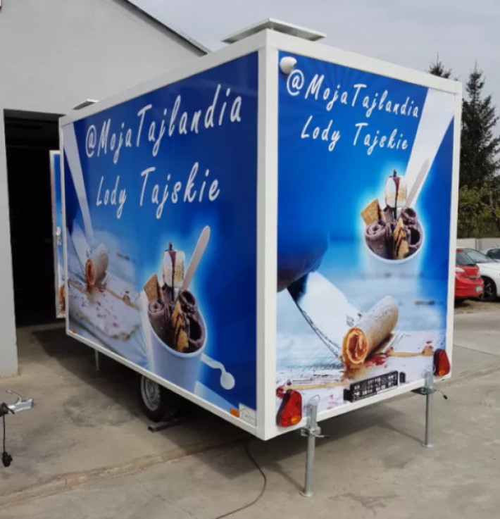Przyczepa przygotowana pod lody tajskie, ale jest miejsce na inne rzeczy np gofry, naleśniki, kawę, inne desery.