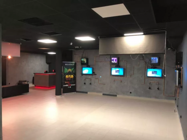 - arenę VR: 4 komputery plecakowe dostosowane do gier VR - Zotac VR Go, 4 headsety - HTC Vive, 4 zestawy karabinów i słuchawek
