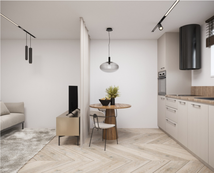 -przestronnego salonu z aneksem kuchennym;