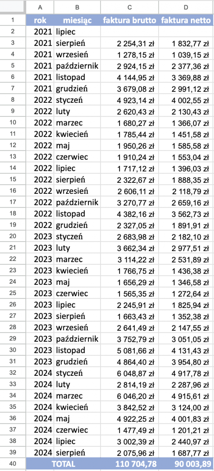 - Roczne dochody w przedziale 30 000 - 35 000 zł, potwierdzone załączonymi zrzutami ekranu z zarobków miesięcznych, rozpoczynając od 2021 roku.