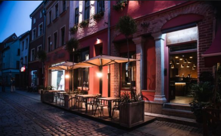 Działalność restauracyjna prowadzona jest na dwóch dolnych poziomach w oparciu o trzy główne sale restauracyjne, uzupełnione barem, kuchnią, patio, dwoma łazienkami oraz dedykowanym zewnętrznym ogródkiem letnim.