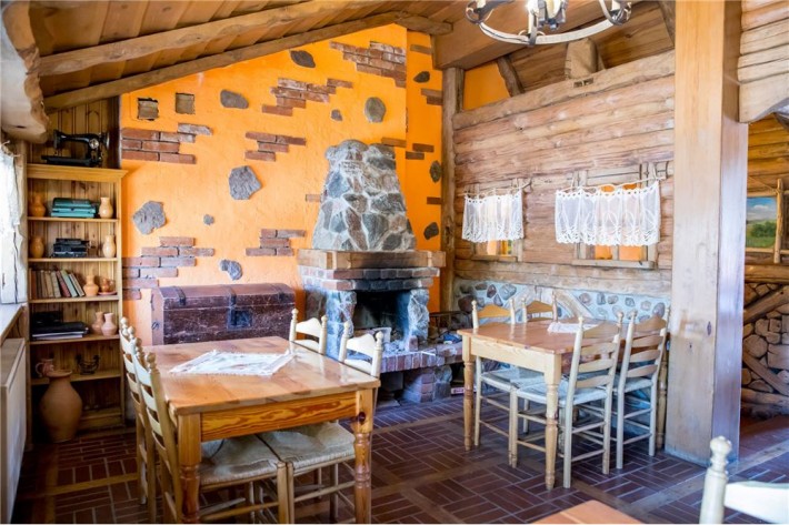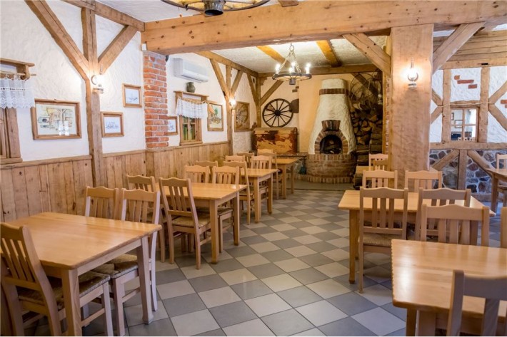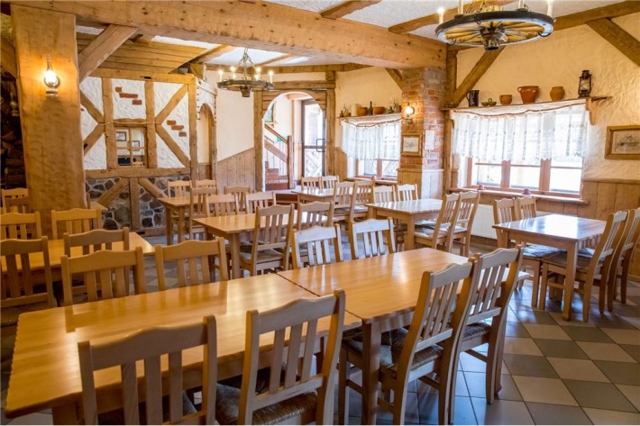 widna, przestronna sala jadalna o powierzchni około 90 m2, wyposażona w 15 stołów i 60 krzeseł, łazienka, bar, kominek, toaleta.