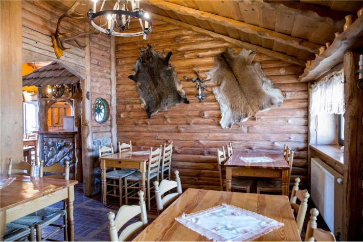 2 sale jadalne, połączone drewnianym barem, robionym na wzór Mazurskiej Chaty; sale są wyposażone w 9 stołów i 36 krzeseł; z większej sali wychodzi się na otaczający budynek taras widokowy, który z sukcesem służył jako letni ogródek z 5 stołami i 10 ławami.