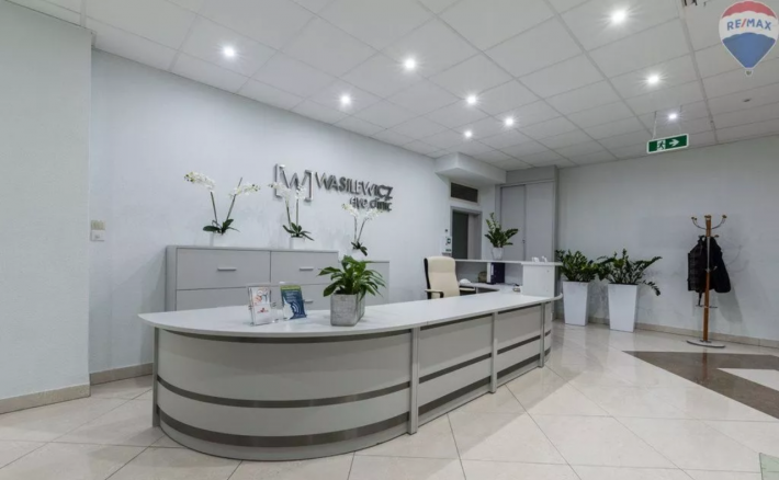 - 2. PIĘTRO: ok. 360 m2; duża recepcja ok. 81 m2 i 7 pomieszczeń z potencjałem usługowym (1 wynajmowane już na gabinet lekarski);