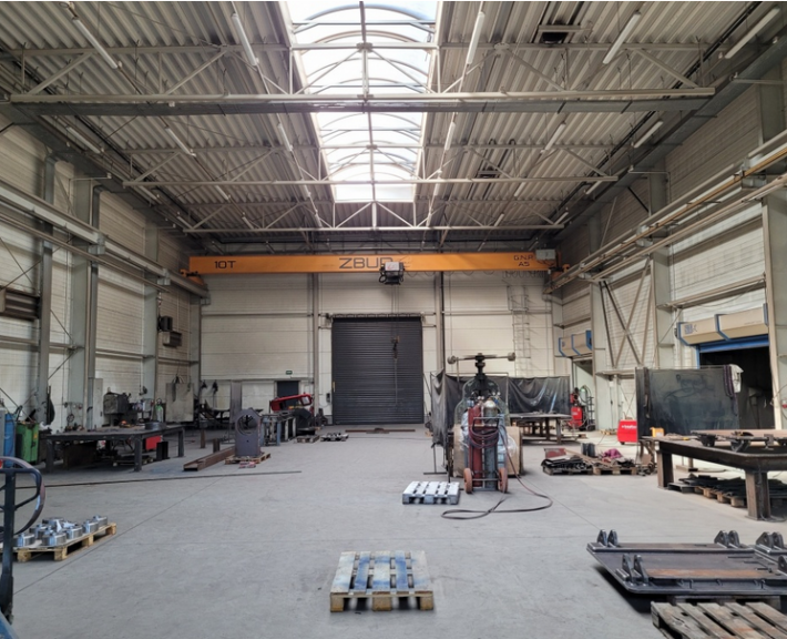 - części produkcyjnej obejmującej halę o pow. 568m2 i wys. użytkowej do spodu dźwigarów 7,75 m, wyposażonej w posadzkę bezpyłową o nośności 50kN/m2, suwnicę o udźwigu 10t (wys. haka 6,10 m), 2 otwierane elektrycznie bramy rolowane z poziomu terenu o wym. h x s 4,5 x 4m oraz pomieszczenia komory śrutowniczej, lakierniczej, magazynu i mieszalni farb o łącznej pow. 141 m2,