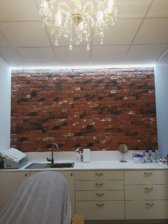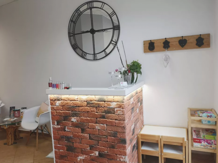podświetlana recepcja robiona na wymiar z ceglanym przodem oraz wieżą sterującą systemem nagłośnieniowym, lustrzany zegar, wieszaki na ubrania dla klientów, stolik kawowy z naturalnego pnia z hartowanym szklanym blatem (robiony na zamówienie) + fotele, kącik zabaw dla dzieci (drewniany stolik i krzesełka), 2 stanowiska do paznokci z szafkami zawierającymi wysuwane carga + krzesełka, 2 komody z szufladami i szklanymi blatami, lustro w ozdobnej ramie, szklana witryna