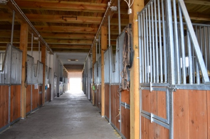 2. Stajnia- murowana, kryta blachą, 16 boksów, izolatka, myjnia dla koni, paszarnia, siodlarnia, szeroki korytarz, pomieszczenie socjalne z łazienką z prysznicem, podłączenie do oczyszczalni, piwnica, na piętrze trzy ładnie wykończone pokoje z łazienką.