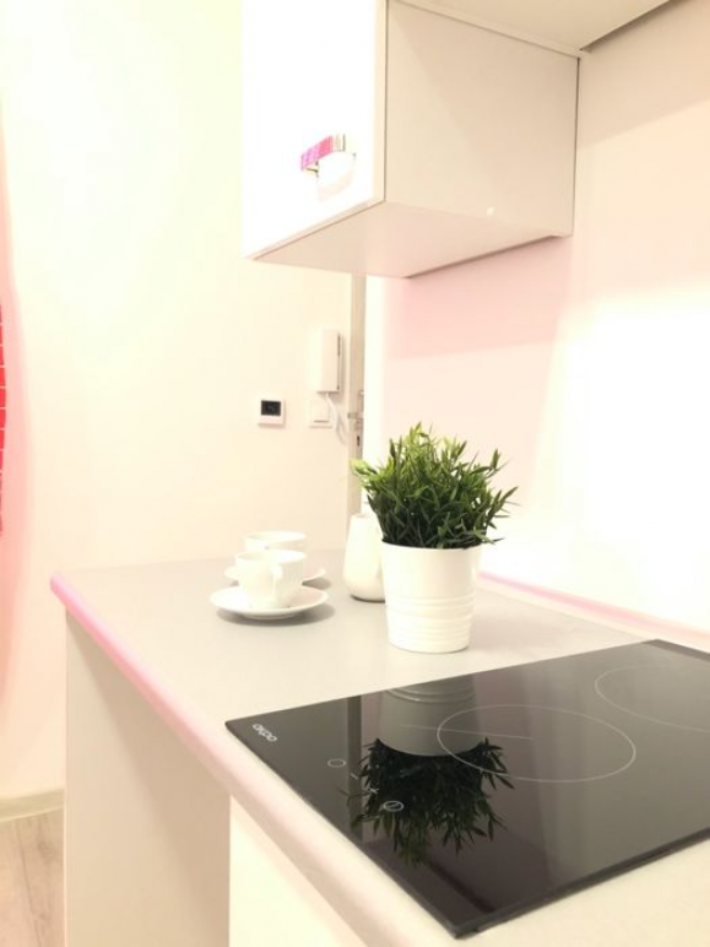 Aneks kuchenny z płytą grzewczą, zlewem, blatem roboczym, szafkami.