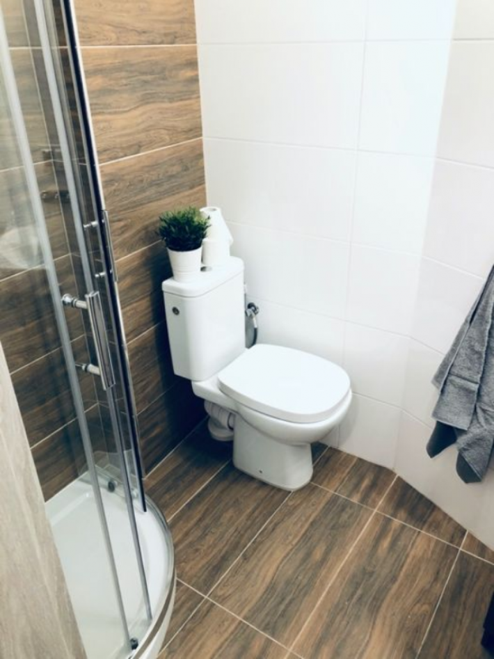 Łazienki w kawalerkach wyposażone w WC, prysznic, szafkę, lustro oraz umywalkę.