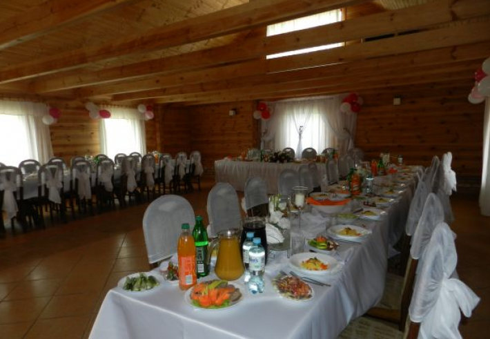 2. Sala biesiadna nr I o powierzchni 214 m kw. z antresolą, 3 toalety, ogrzewaniem podłogowym, kotłownią (piec węglowy), pomieszczeniem kuchennym i gospodarczym.