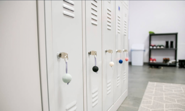 Szatnia wyposażona w estetyczne szafki, ławeczki, wieszak.