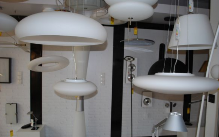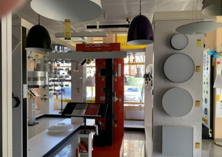 Salon posiada funkcjonalne ekspozytory z instalacja elektryczną do eksponowania opraw oświetleniowych. Jest w pełni zatowarowany oprawami oświetleniowymi z bieżącej oferty producentów i dystrybutorów.
