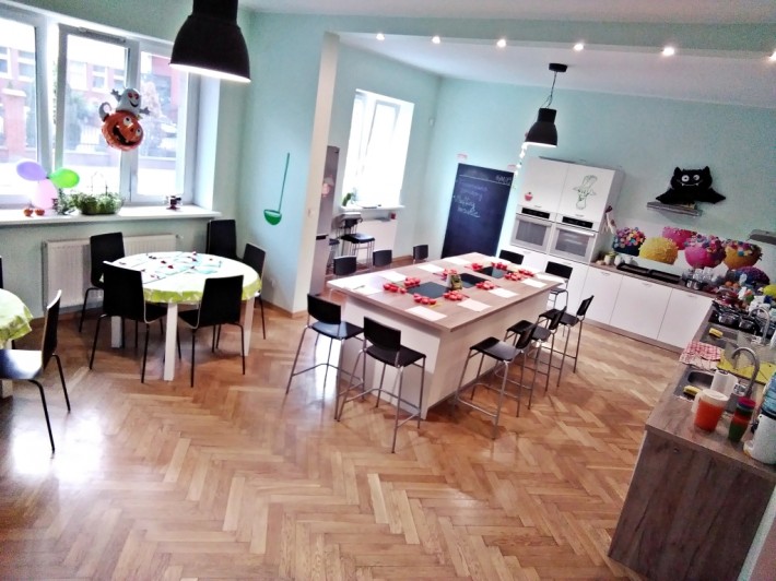 W pełni wyposażona duża kuchnia (50m2) – płyty indukcyjne, lodówka, okapy, piekarniki, meble robione na wymiar, duża wyspa kuchenna (dla około 14 osób), zlewozmywaki, stoły, krzesła. 2 łazienki, duża szatnia, kącik gospodarczy. Szkoła prowadzi głównie warsztaty dla dzieci oraz kulinarne przyjęcia okolicznościowe. Rozpoznawalna marka w Łodzi i okolicy. Idealny biznes dla kucharza, dietetyka, pasjonaty gotowania.