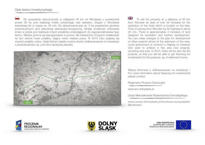 Advertisement: Teren 31ha pod inwestycję wraz z jeziorem i lasem w Żarowie koło Wrocławia is archived because the advertiser did not renew it. At the moment, there is no way to contact the advertiser. Leave your email address if you want to be notified when the advertisement is activated.