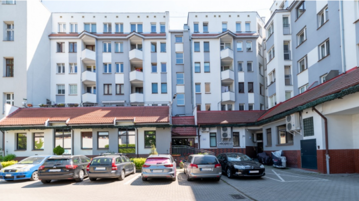 Duża liczba ogólnodostępnych miejsc parkingowych bezpośrednio przed budynkiem oraz na wewnętrznym dziedzińcu.
