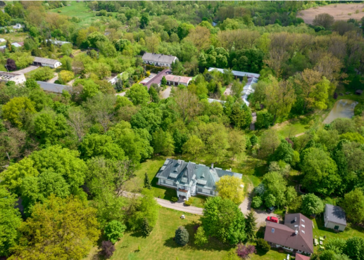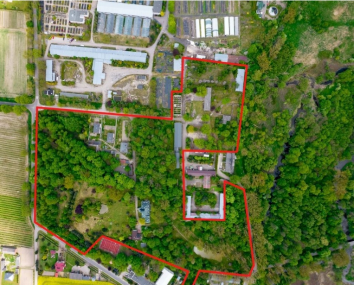 Pierwsza część to obszar 5,5, ha, na którym znajduje się park ze starodrzewem, budynek główny dworu wraz z