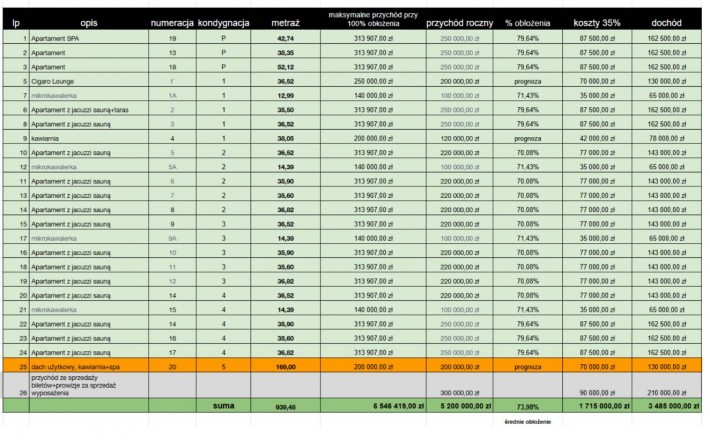 – Przychód z 1 apartamentu: ok. 20 000 zł/miesiąc