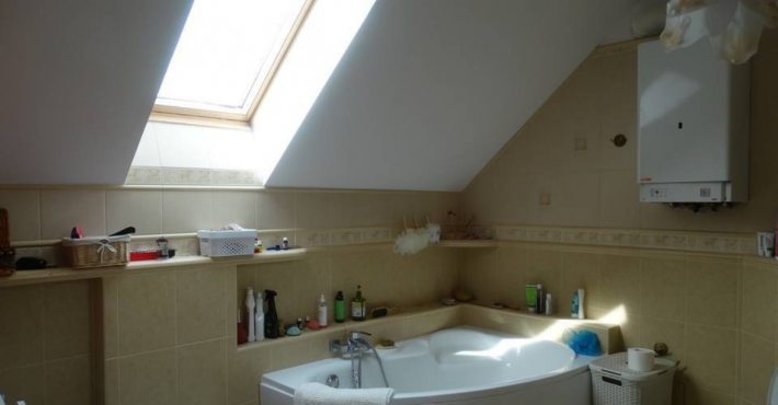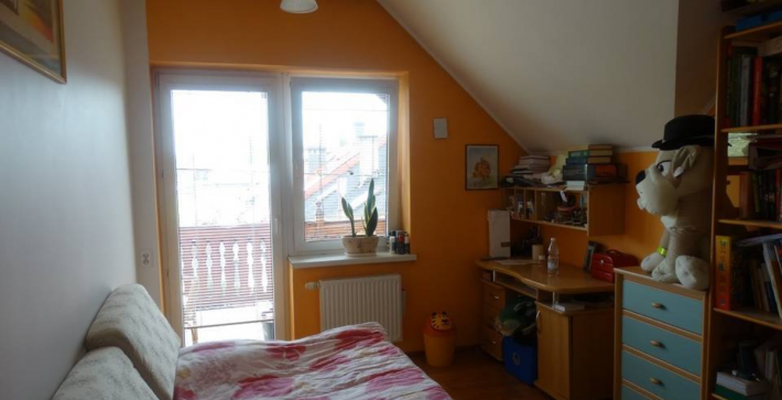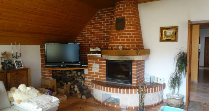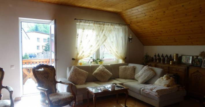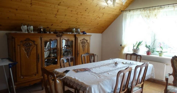 Na piętrze duże przestronne mieszkanie o powierzchni 128m2 składające się z : pokój dzienny z kominkiem 38,57m2, pokój 11,43m2, pokój 11,47m2, sypialnia 16,70m2, kuchnia 18,34m2, przedpokój 10,76m2, spiżarka 1,32m2, wc 1,68m2, łazienka 9,73m2, aneks 2,93m2, klatka schodowa 5,25m2,balkony.
