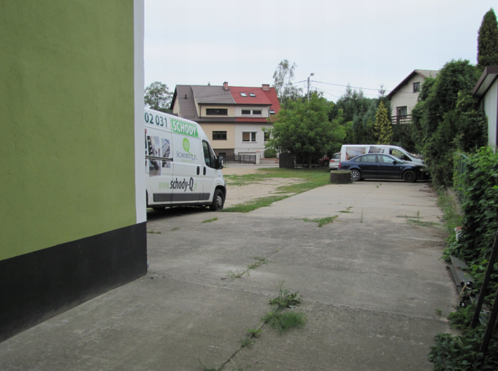 Wokół budynku betonowa posadzka wylana az do ogrodzenia
