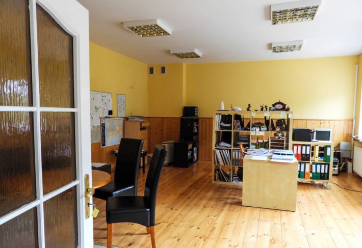 - część administracyjno socjalna 549 m2 w tym wysokie piwnice 286 m2, biura i część socjalna 262 m2, mieszkanie 70 m2