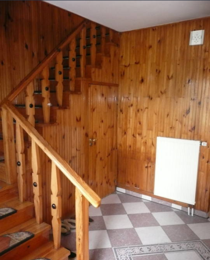 Część mieszkalna znajduje się na pierwszym piętrze budynku i składa się z 5 pokoi, garderoby, kuchni spiżarni, osobnej łazienki i wc. Z kuchni wychodzi się na częściowo zadaszony taras. Na podłogach wyłożony parkiet, w kuchni i łazience terakota.