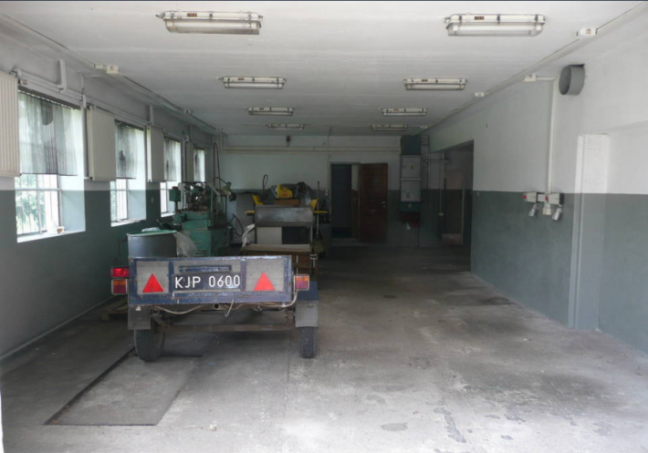 Część produkcyjną stanowi główna hala o wym. d.12,5m. sz. 5,7m. w. 3m. z bramą wjazdową sz.3,6m. w.2,5m. oraz pomieszczenie boczne o pow. 50 m2. Hala posiada w posadzce kanał. Do hali przynależy pomieszczenie socjalne z magazynkiem, szatnią, umywalkami i wc. Hala jest ogrzewana.