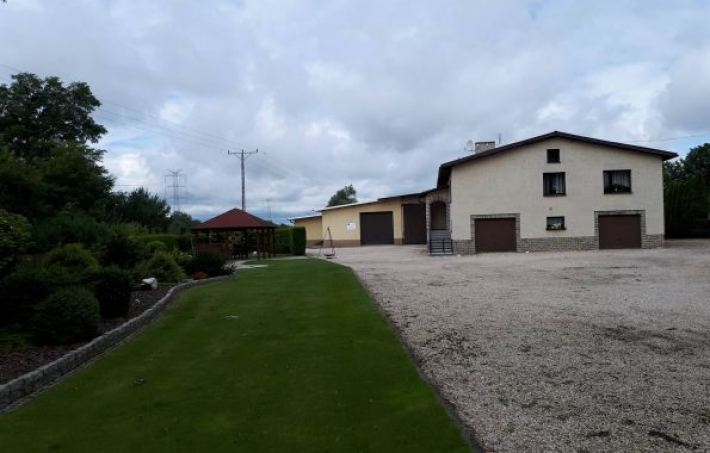 Otoczenie domu zadbane i zagospodarowane (drewniana altanka, skalniak), bez bezpośredniego sąsiedztwa. Na części działki łąka z małym laskiem. Osobny wjazd do domu i hali (dwie bramy).