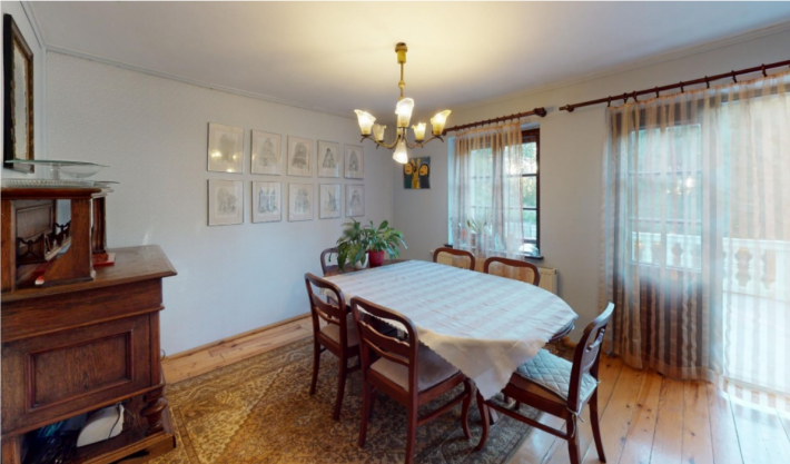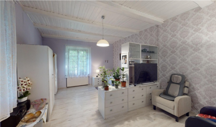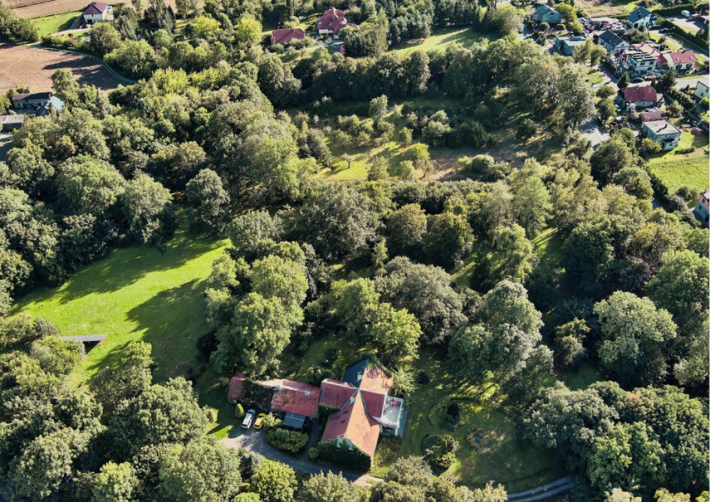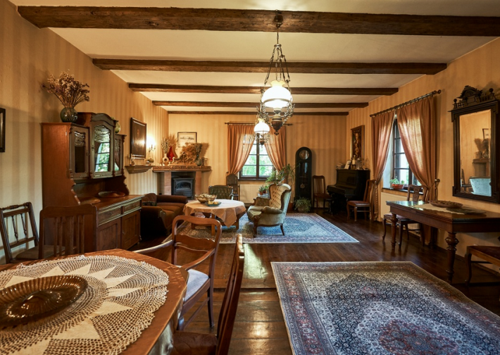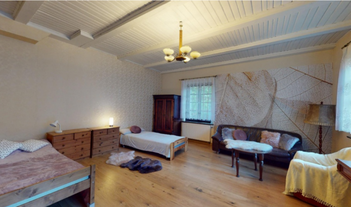 W pobliżu dworu właściciele wybudowali urokliwy całoroczny piętrowy domek o powierzchni użytkowej 55 m2 z 4 pokojami, kuchnią i łazienką. Dom jest konstrukcji drewnianej zasilany pompą ciepła, a ta prądem z fotowoltaiki.