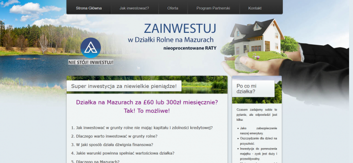Przedmiotem inwestycyjnym są starannie wyselekcjonowane działki na Mazurach o statusie gruntu rolnego głównie kalsa IV-VI (czyli w najwcześniejszym etapie rozwoju) o powierzchni minimalnej 3000 m2. W odległości ok 20-30 km. od Olsztyna. Z dostępem do mediów - prąd. Oczywiście atrakcyjne położenie działek w pobliżu jezior.