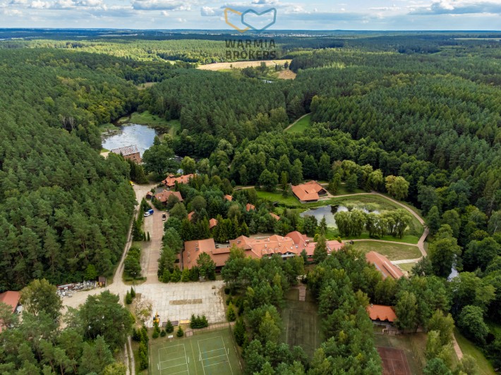 - Budynek konferencyjny z kręgielnią, powierzchnia 1032,6 m2, 3 sale konferencyjne, nowoczesne zaplecze kuchenne, 4-torowa kręgielnia z oddzielną salą bilardową i barem - nr 4 i 5 na zdjeciu z drona