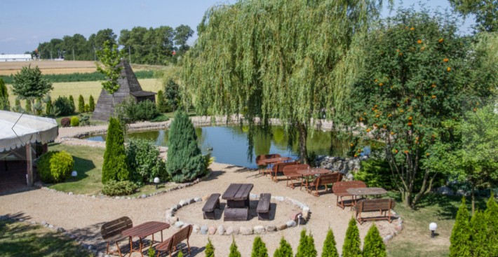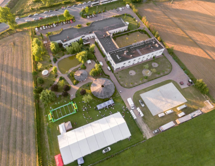 Na terenie działki znajduje się parking dla samochodów osobowych i autobusów, oczko wodne, ogród z licznymi nasadzeniami i drzewostanem, wigwam, toalety, profesjonalne nawadniane boisko do piłki nożnej wraz z piłkochwytami, profesjonalne boisko do piłki plażowej, ogródek piwny, taras oraz obszerne trawniki i tereny zielone. Do zagospodarowania pozostaje obszar ponad 20 000 m. kw.