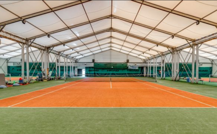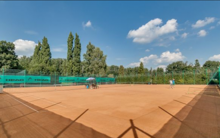 Zewnętrzna strefa to 3 korty tenisowe ziemne, jeden treningowy z ścianką do ćwiczeń + budynek z sanitariatami, 2 parkingi
