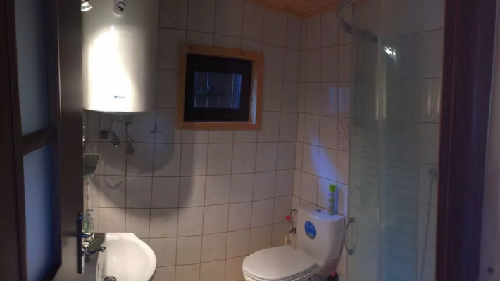 Na parterze znajduje się pokój dzienny , w którym jest dwuosobowa rozkładana sofa, stół i krzesła, telewizor, a także aneks kuchenny i łazienka Aneks kuchenny wyposażony jest w lodówkę, czajnik, zlewozmywak, kuchenkę elektryczną, zestaw naczyń i garnków kuchennych .
