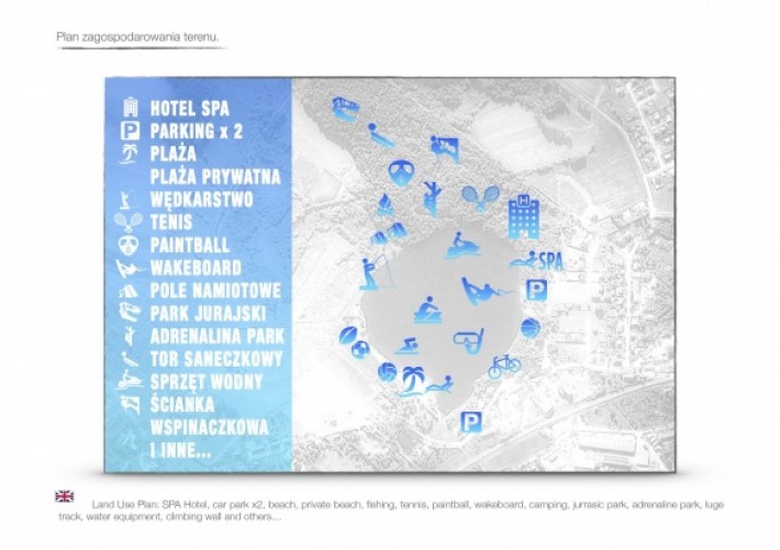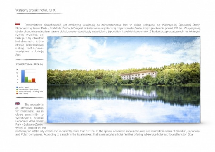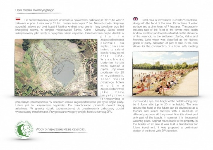 Ponad 30,8878 ha terenów rekreacyjno-wypoczynkowych koło Wrocławia wraz z zalewem pow. lustra wody 15 ha i lasem sosnowym 7 ha. Wody o wysokiej klasie czystości ( woda zdolnych źródeł gruntowych), akwen od zawsze był zarybiany przez P.Z.W. i prywatnego właściciela. Przeznaczenie działek pozwala na wybudowanie np. hotelu w tym większej Sali do wynajęcia na cele komercyjne z salą konferencyjną oraz S P A , las usytuowany jest na wzniesieniach i na płaskim terenie co dodaje jeszcze większego uroku, można go zagospodarować na „Małpi Gaj”z 400 m liną do zjazdu nad lustrem wody oraz kompleks drewnianych domków całorocznych do wynajęcia lub sprzedania. Możliwość organizacji bazy turystycznej np. wypożyczalnia sprzętu wodnego,Dino park w lesie,kłady zjeżdżalnia saneczkowa itp. miejsca wystarczy na wiele jeszcze innych pomysłów. Możliwość zorganizowania łowiska komercyjnego oraz umowy za szkółkami nurkowymi i klubami karpiowymi z całej Polski. W obecnym czasie zagospodarowana została tylko mała część plaży. Latem jest to bardzo uczęszczane kąpielisko (brak alternatywy). Jedna strona zalewu ciągnie się wzdłuż asfaltowej drogi w Żarowie,Ponad 3 ha są przeznaczone pod zabudowę rekreacyjno - turystyczną. Posiadam wstępny projekt hotelu, Hotel może mieć 3 piętra wysokości + użytkowe poddasze lub 20 m wysokości. Kompleks znajduje się na uboczu miasta w promilu 35 km rozwijają się 4 duże strefy przemysłowe. Możliwość dialogu z miastem powiatowym lub gminą – kompleks może służyć jako np. Centrum sportów wodnych lub coś w tym kontekście to byłoby niewątpliwie jedyne w okolicy tak duże miejsce rozrywki dla mieszkańców i turystów. Teren posiada ogromny niewykorzystany potencjał. Miejsce bardzo reprezentatywne. Istnieje możliwość dofinansowania z UE na infrastrukturę.