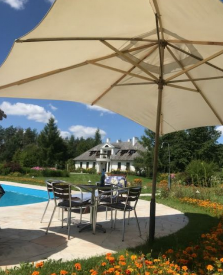 Działkę można nabyć wyłącznie jako całość! Nabywca może tam zbudować najpiękniejsze w regionie świętokrzyskim osiedle mieszkaniowe zagubione w parku, pośród otaczających lasów, nad rzeką lub też kupić teren jako prywatną posiadłość, bowiem znajduje się tam zamieszkały, kryty gontem dwór, wyjęty niczym z „Pana Tadeusza”, a także budynek gospodarczy i garażowy w poetyce dworku (także kryty gontem), jak również basen, kort tenisowy, dwa stawy, pomosty nad rzeką, alejki z latarniami, fontanny, podświetlane, zbudowane z piaskowca kwietne gazony, skupiska krzewów i kwiatów, park z unikalnymi drzewami i krzewami, a cały teren ma podziemny system rozprowadzania nawadniania ze zraszaczami oraz grill i wędzarnię. Wieczorem cała, podświetlona (włącznie z alejkami i gazonami) posiadłość przypomina zagraniczny kurort. Kwota całości (7,6 ha terenu budowlanego z budynkami i wszystkimi w.w. obiektami) – 8 500 000 PLN.