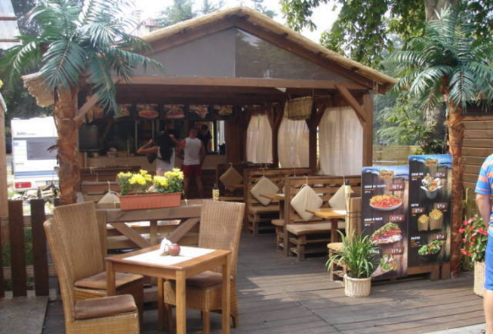 Wiata frontowa składa się z podłogi i zadaszenia, zawiera 6 czteroosobowych boksów co daje łącznie 24 miejsca siedzące. Do tego dochodzi również menu wewnętrzne oraz zewnętrzne, szyld, zasłony, dekoracje, zabudowa przyczepy oraz dwie wysokiej jakości palmy. Podłoga o wymiarach 5,8m x 4,2m składa się z ośmiu podestów.